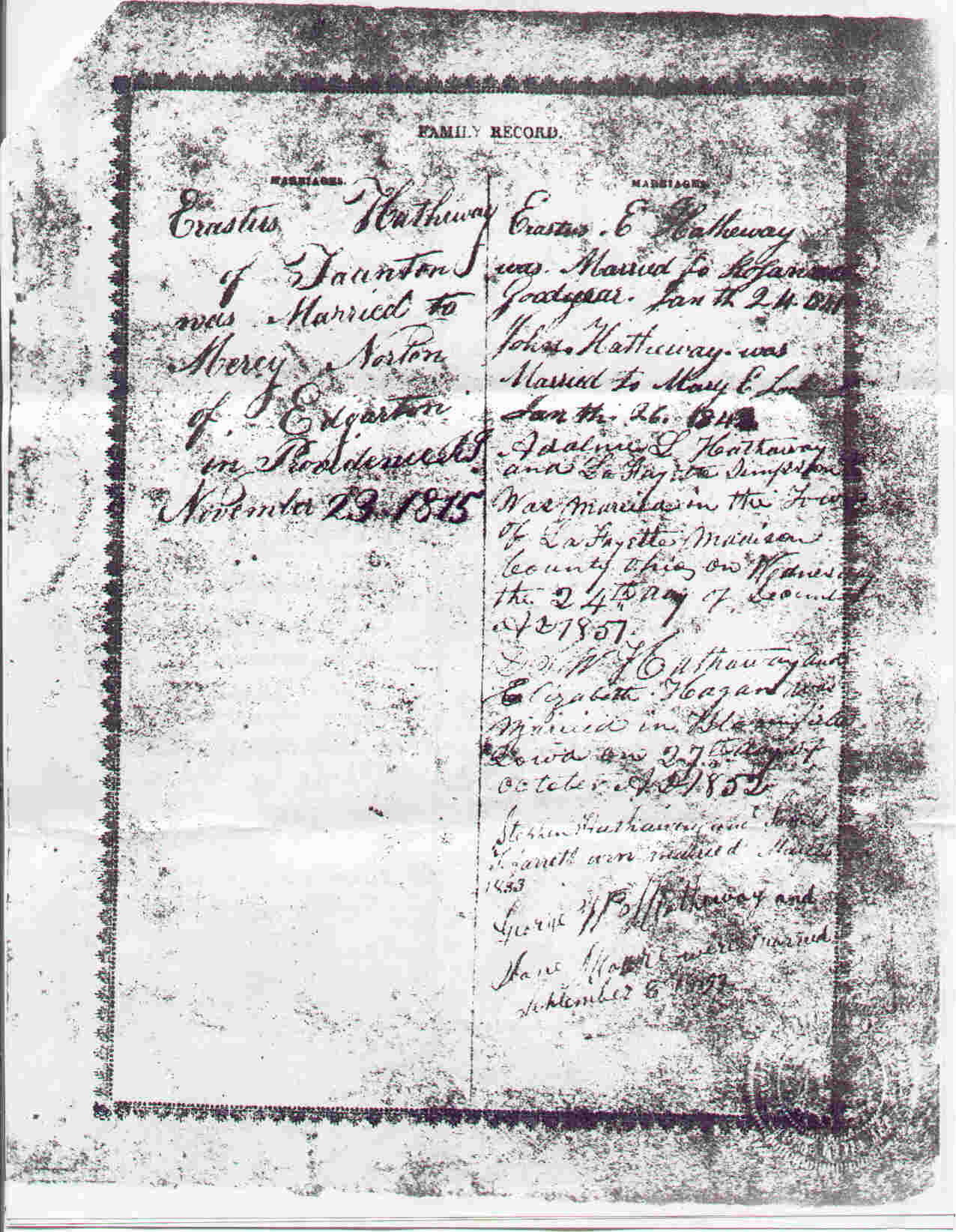 | Erastus Hatheway of Taunton was Married to Mercy Norton of Edgarton in Providence, R.I., November 23, 1815 Erastus E. Hatheway was Married to Rosanna Goodyear. Jan th 24 1841 John Hatheway was Married to Mary E. Lockwood Jan th 26, 1842 Adaline L. Hathaway and LaFayette Simpson Was married in the Town of LaFayette, Madison County Ohio, on Wednesday the 24th day of December AD 1857 (1?) D.S.W. Hathaway and Elizabeth Hagan was married in Bloomfield, Iowa on 27th day of October AD 1852 Stephen Hathaway and Sarah T. Jarrett were married May 26, 1833 George W. Hatheway and Jane Moore were married September 8, 1853 |