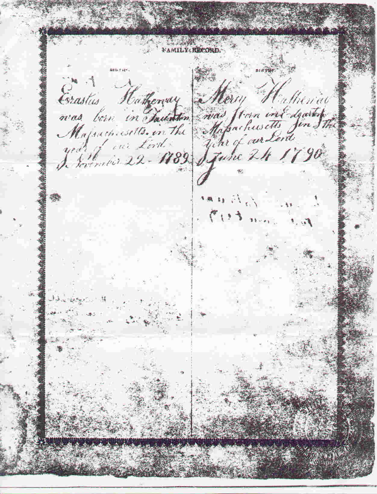 | Erastus Hatheway was born in Taunton, Massachusetts in the year of our Lord November 22, 1789 Mercy Hatheway was born in Edgarton, Massachusetts in the year of our Lord June 24, 1790 |
