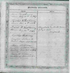 | James Hathaway Born May 15th 1827 Rachel D. Hathaway Born Nov. 6th 1834 Isreal F. Hathaway Born Aug 20th 1851 Cynthia Hathaway Daughter of James & Rachel Born Sept 25th 1853 Mary Hatheway Daughter of James and Rachel Born Feb. 10 , 1856 Rhody S. Hathaway Daughter of James & Rachel Born (April) 18th 1857 |